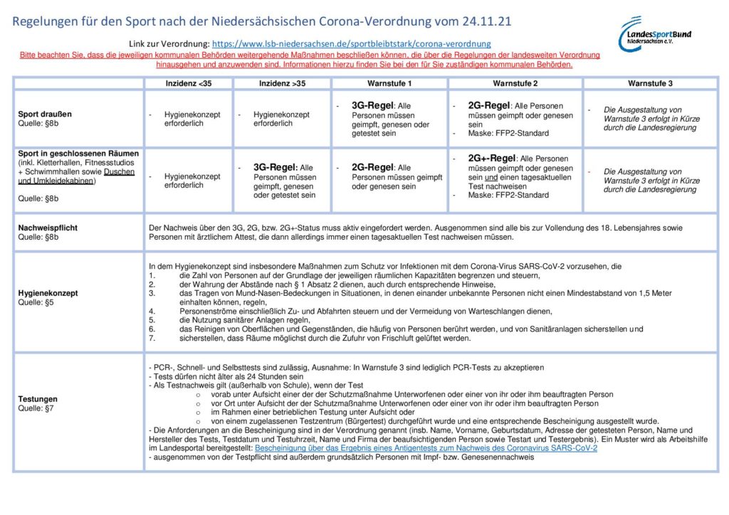 Die jeweils neueste Corona-Verordnung finden Sie auf der Homepage des Landkreises Wesermarsch: https://landkreis-wesermarsch.de/ sowie auf der Homepage des LSB`s hier: https://www.lsb-niedersachsen.de/sportbleibtstark/corona-verordnung